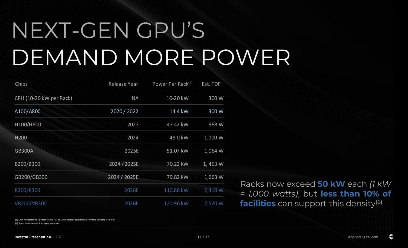 AppliedDigital.com NEXT-GEN GPU’S DEMAND MORE POWER Investor Presentation— 2025 (5) Demand Jefferie s – presentation – AI to D rive Increasing Demand for D ata Centers & Power (6) Spear Investments & company re ports CPU (10-20 kW per Rack) NA 10-20 kW 300 W A100/A800 2020 / 2022 14.4 kW 300 W H100/H800 2023 47.42 kW 988 W H200 2024 48.0 kW 1,000 W GB300A 2025E 51.07 kW 1,064 W B200/B300 2024 / 2025E 70.22 kW 1, 463 W GB200/GB300 2024 / 2025E 79.82 kW 1,663 W R200/R300 2026E 110.88 kW 2,310 W VR200/VR300 2026E 120.96 kW 2,520 W Chips Release Year Power Per Rack(5) Est. TDP Racks now exceed 50 kW each (1 kW = 1,000 watts), but less than 10% of facilities can support this density(6) 11 / 37