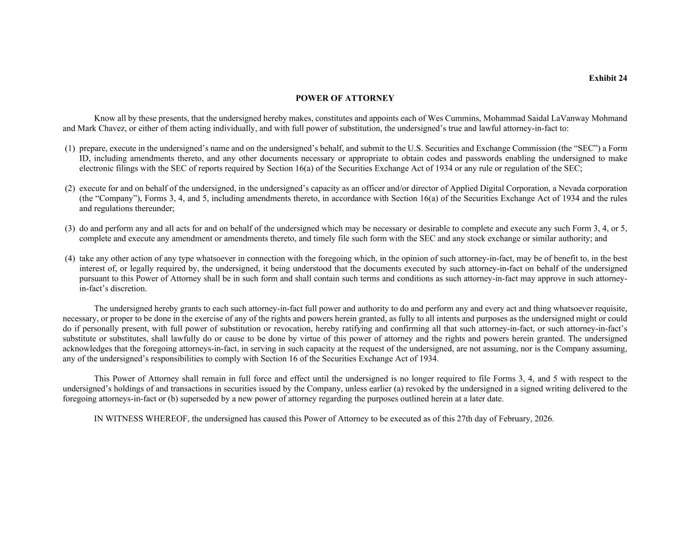 Exhibit 24 POWER OF ATTORNEY Know all by these presents, that the undersigned hereby makes, constitutes and appoints each of Wes Cummins, Mohammad Saidal LaVanway Mohmand and Mark Chavez, or either of them acting individually, and with full power of substitution, the undersigned’s true and lawful attorney-in-fact to: (1) prepare, execute in the undersigned’s name and on the undersigned’s behalf, and submit to the U.S. Securities and Exchange Commission (the “SEC”) a Form ID, including amendments thereto, and any other documents necessary or appropriate to obtain codes and passwords enabling the undersigned to make electronic filings with the SEC of reports required by Section 16(a) of the Securities Exchange Act of 1934 or any rule or regulation of the SEC; (2) execute for and on behalf of the undersigned, in the undersigned’s capacity as an officer and/or director of Applied Digital Corporation, a Nevada corporation (the “Company”), Forms 3, 4, and 5, including amendments thereto, in accordance with Section 16(a) of the Securities Exchange Act of 1934 and the rules and regulations thereunder; (3) do and perform any and all acts for and on behalf of the undersigned which may be necessary or desirable to complete and execute any such Form 3, 4, or 5, complete and execute any amendment or amendments thereto, and timely file such form with the SEC and any stock exchange or similar authority; and (4) take any other action of any type whatsoever in connection with the foregoing which, in the opinion of such attorney-in-fact, may be of benefit to, in the best interest of, or legally required by, the undersigned, it being understood that the documents executed by such attorney-in-fact on behalf of the undersigned pursuant to this Power of Attorney shall be in such form and shall contain such terms and conditions as such attorney-in-fact may approve in such attorney- in-fact’s discretion. The undersigned hereby grants to each such attorney-in-fact full power and authority to do and perform any and every act and thing whatsoever requisite, necessary, or proper to be done in the exercise of any of the rights and powers herein granted, as fully to all intents and purposes as the undersigned might or could do if personally present, with full power of substitution or revocation, hereby ratifying and confirming all that such attorney-in-fact, or such attorney-in-fact’s substitute or substitutes, shall lawfully do or cause to be done by virtue of this power of attorney and the rights and powers herein granted. The undersigned acknowledges that the foregoing attorneys-in-fact, in serving in such capacity at the request of the undersigned, are not assuming, nor is the Company assuming, any of the undersigned’s responsibilities to comply with Section 16 of the Securities Exchange Act of 1934. This Power of Attorney shall remain in full force and effect until the undersigned is no longer required to file Forms 3, 4, and 5 with respect to the undersigned’s holdings of and transactions in securities issued by the Company, unless earlier (a) revoked by the undersigned in a signed writing delivered to the foregoing attorneys-in-fact or (b) superseded by a new power of attorney regarding the purposes outlined herein at a later date. IN WITNESS WHEREOF, the undersigned has caused this Power of Attorney to be executed as of this 27th day of February, 2026.