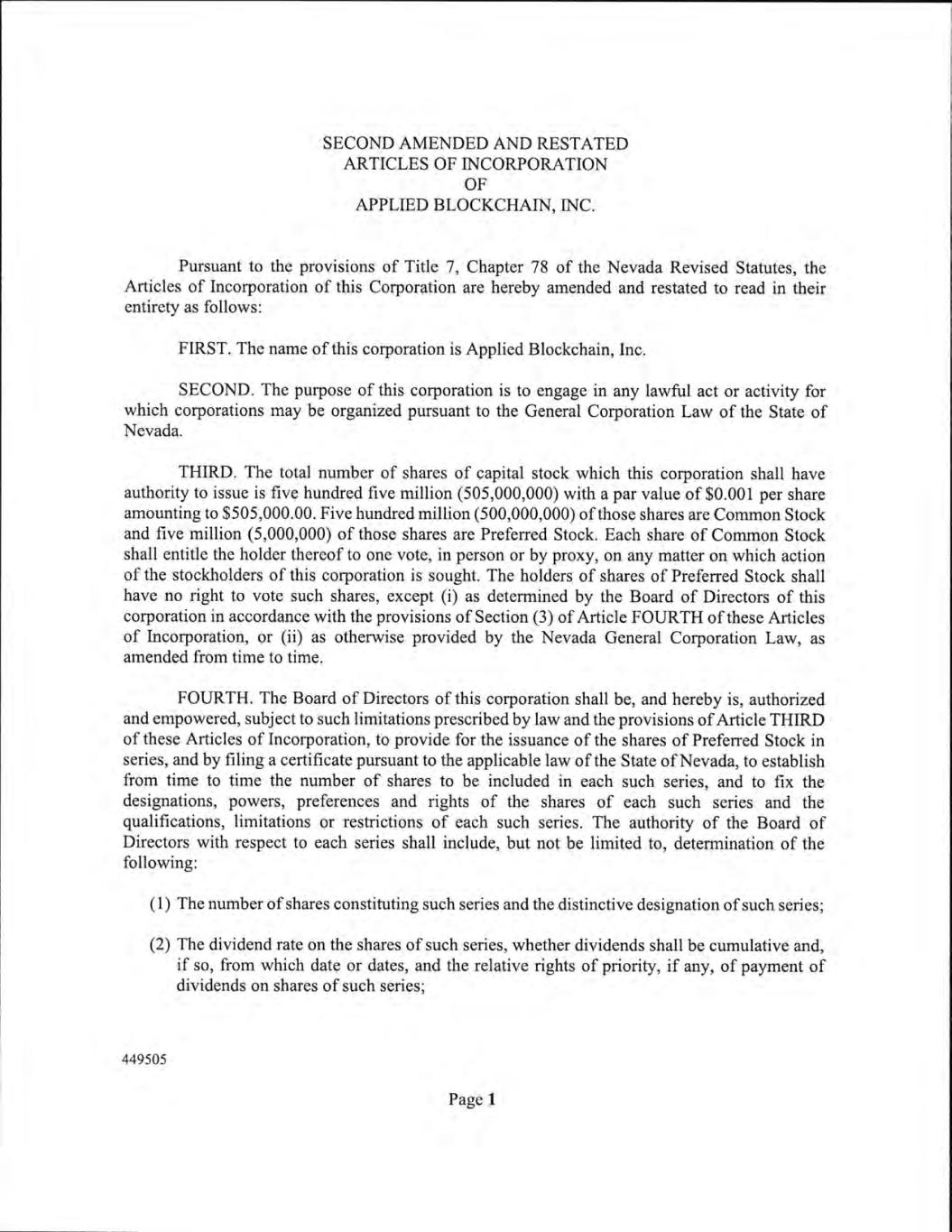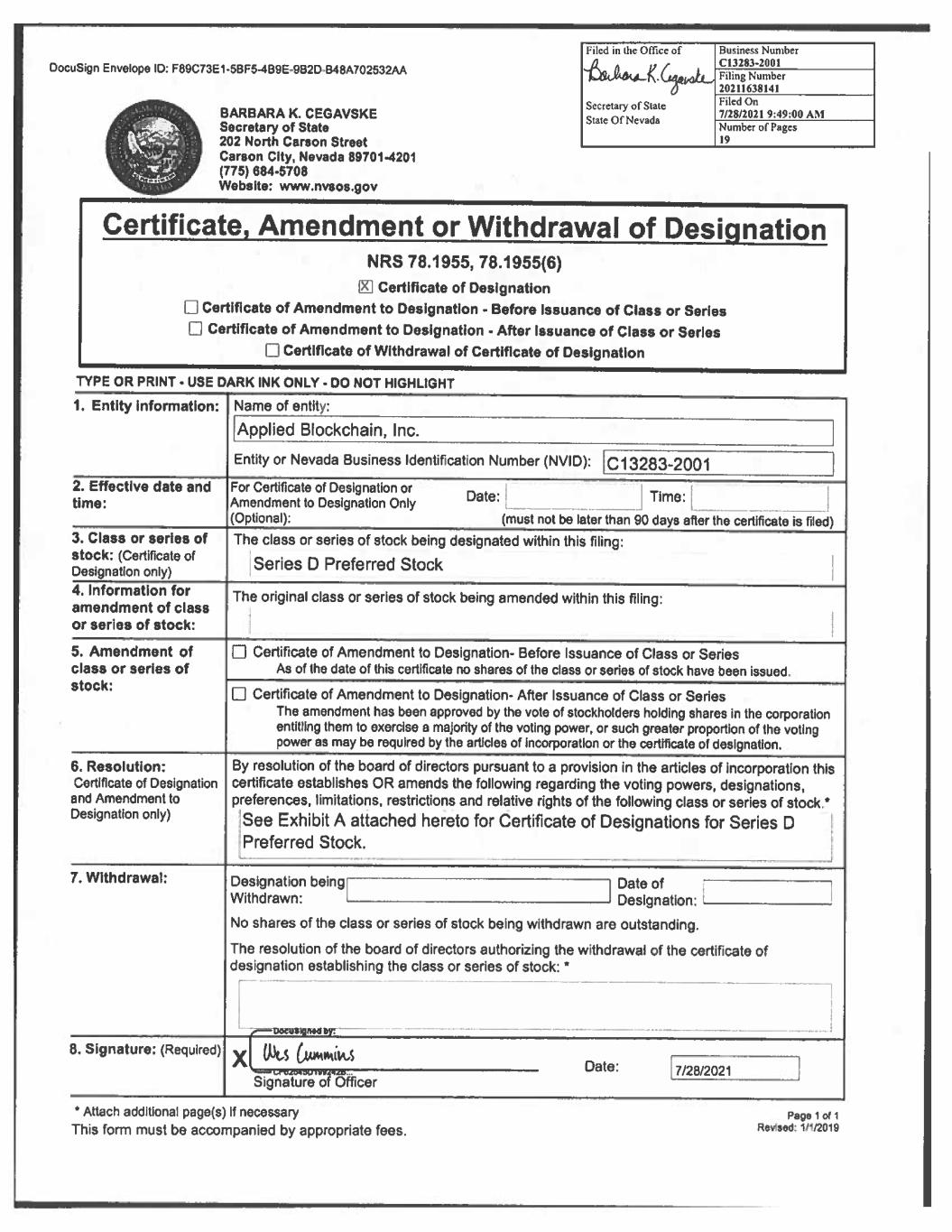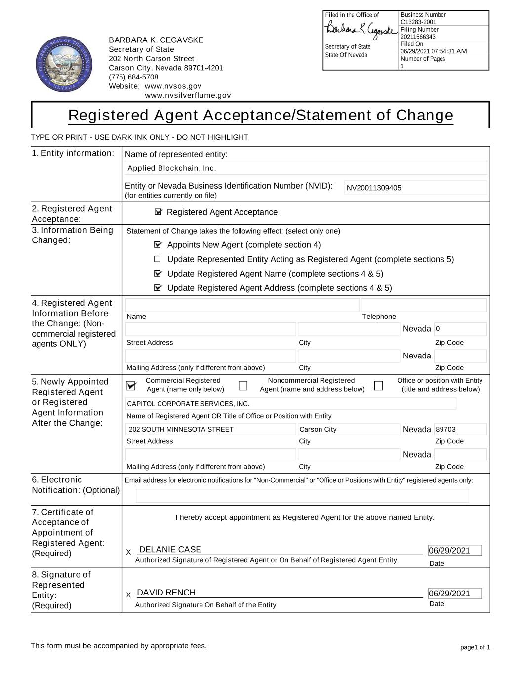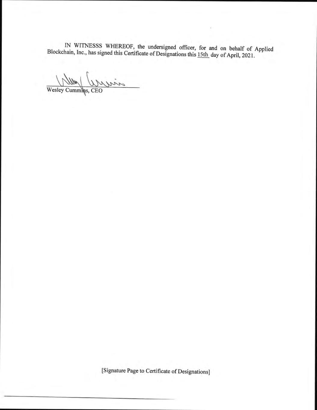 TYPE OR PRINT - USE DARK INK ONLY - DO NOT HIGHLIGHT 1. Entity information: Name of represented entity: Applied Blockchain, Inc. Entity or Nevada Business Identification Number (NVID): (for entities currently on file) NV20011309405 2. Registered Agent Acceptance: Registered Agent Acceptance 3. Information Being Changed: Statement of Change takes the following effect: (select only one) Appoints New Agent (complete section 4) Update Represented Entity Acting as Registered Agent (complete sections 5) Update Registered Agent Name (complete sections 4 & 5) Update Registered Agent Address (complete sections 4 & 5) 4. Registered Agent Information Before the Change: (Non- commercial registered agents ONLY) Name Telephone Nevada 0 Street Address City Zip Code Nevada Mailing Address (only if different from above) City Zip Code 5. Newly Appointed Registered Agent or Registered Agent Information After the Change: Commercial Registered Agent (name only below) Noncommercial Registered Agent (name and address below) Office or position with Entity (title and address below) CAPITOL CORPORATE SERVICES, INC. Name of Registered Agent OR Title of Office or Position with Entity 202 SOUTH MINNESOTA STREET Carson City Nevada 89703 Street Address City Zip Code Nevada Mailing Address (only if different from above) City Zip Code 6. Electronic Notification: (Optional) Email address for electronic notifications for "Non-Commercial" or "Office or Positions with Entity" registered agents only: 7. Certificate of Acceptance of Appointment of Registered Agent: (Required) I hereby accept appointment as Registered Agent for the above named Entity. X DELANIE CASE Authorized Signature of Registered Agent or On Behalf of Registered Agent Entity Date 06/29/2021 8. Signature of Represented Entity: (Required) X DAVID RENCH Authorized Signature On Behalf of the Entity Date 06/29/2021 BARBARA K. CEGAVSKE Secretary of State 202 North Carson Street Carson City, Nevada 89701-4201 (775) 684-5708 Website: www.nvsos.gov www.nvsilverflume.gov Registered Agent Acceptance/Statement of Change This form must be accompanied by appropriate fees. page1 of 1 Filed in the Office of Secretary of State State Of Nevada Business Number C13283-2001 Filing Number 20211566343 Filed On 06/29/2021 07:54:31 AM Number of Pages 1