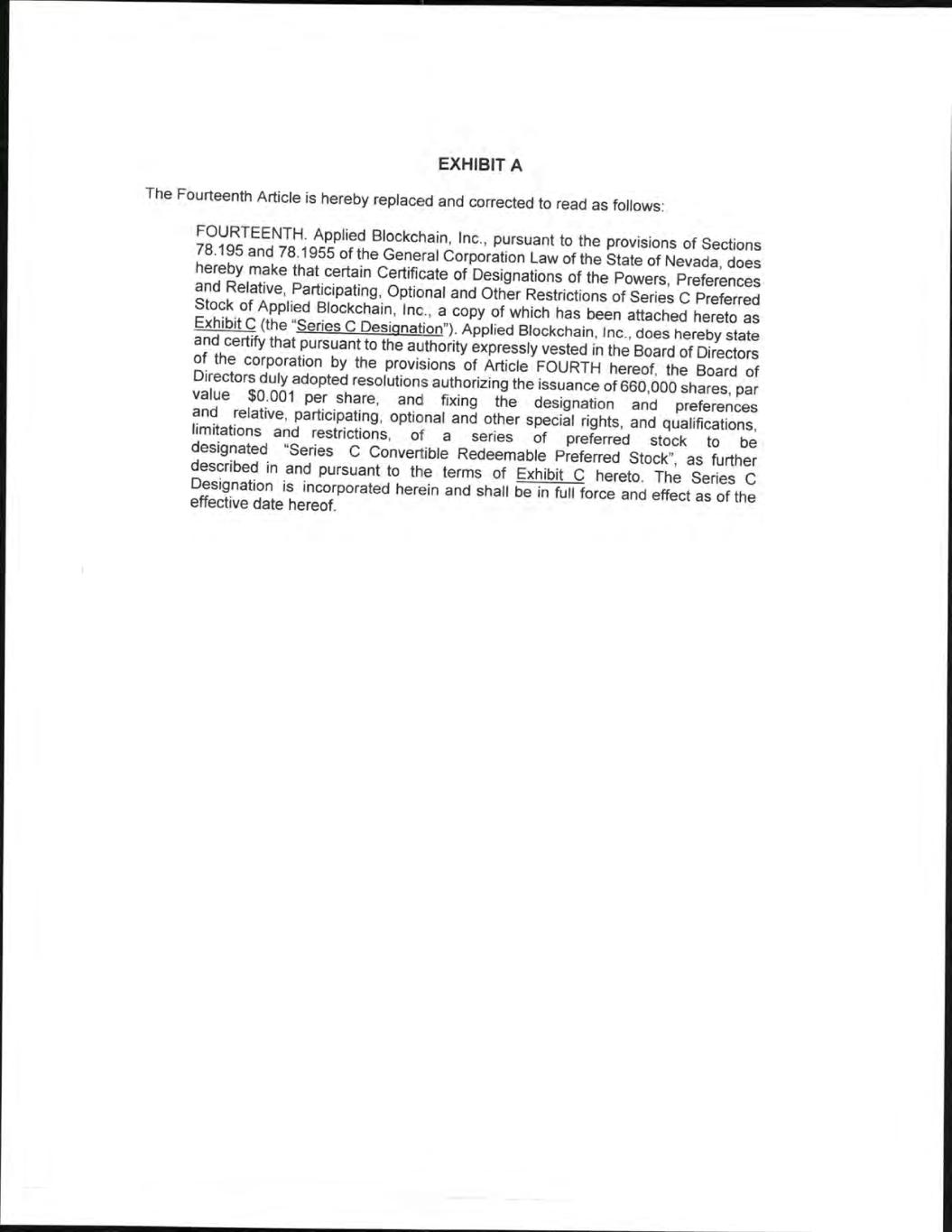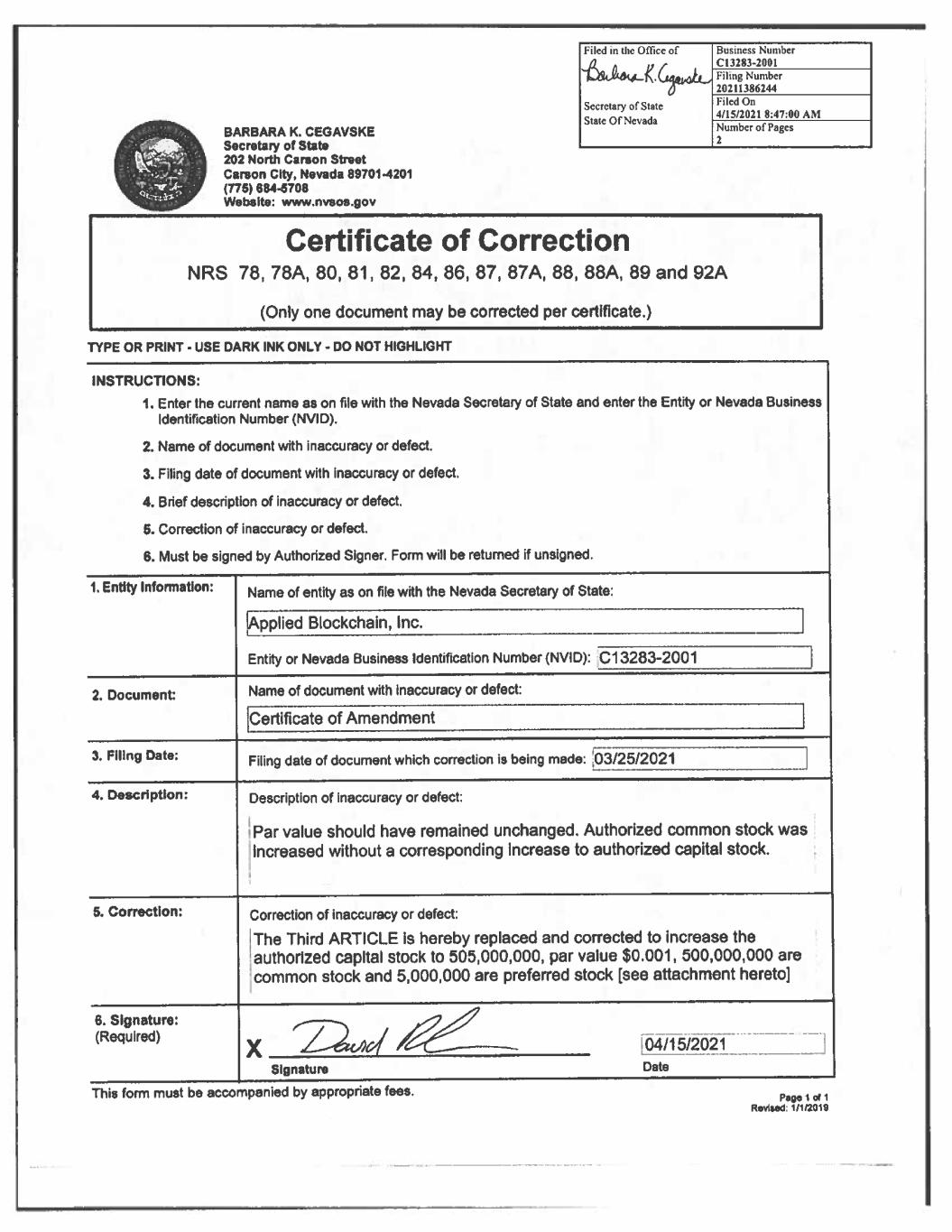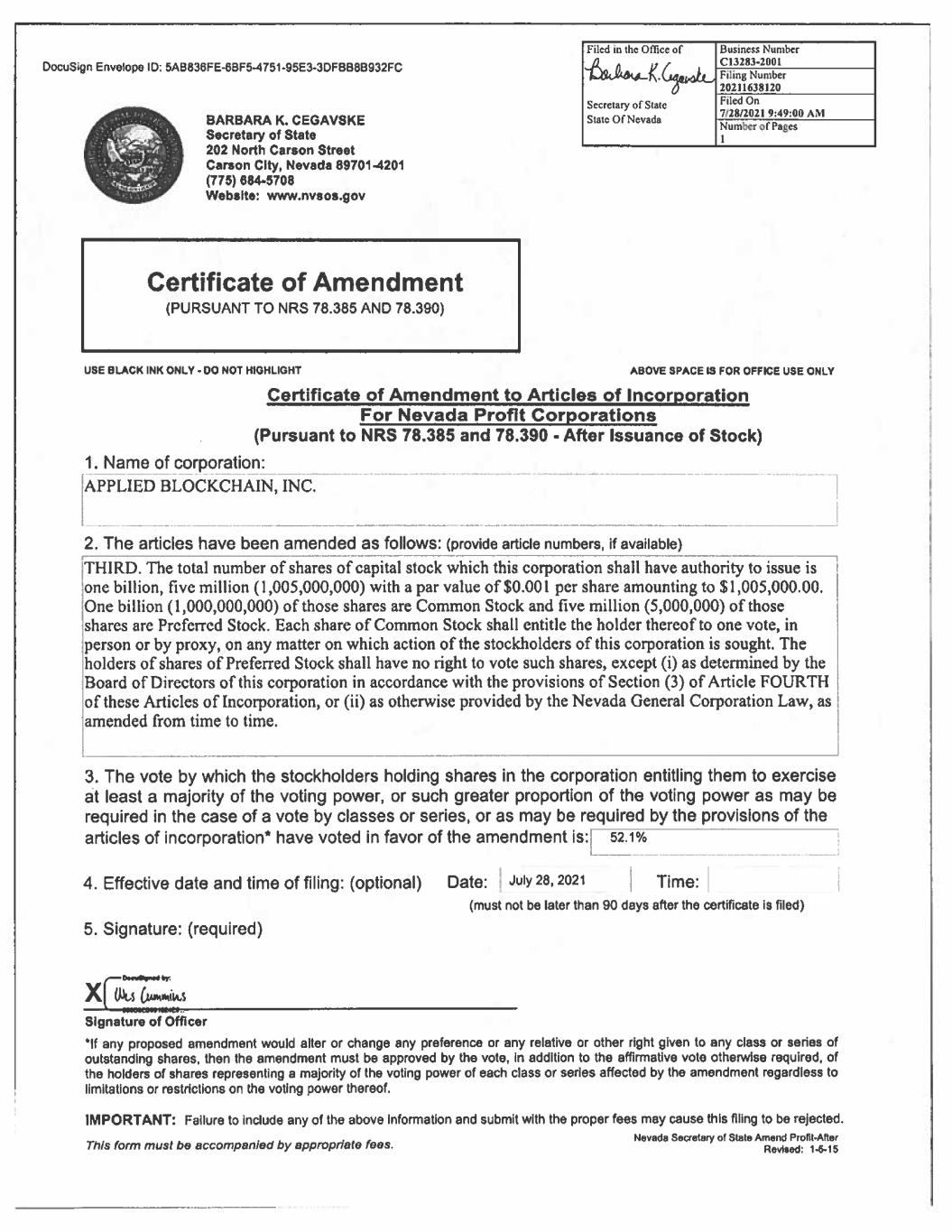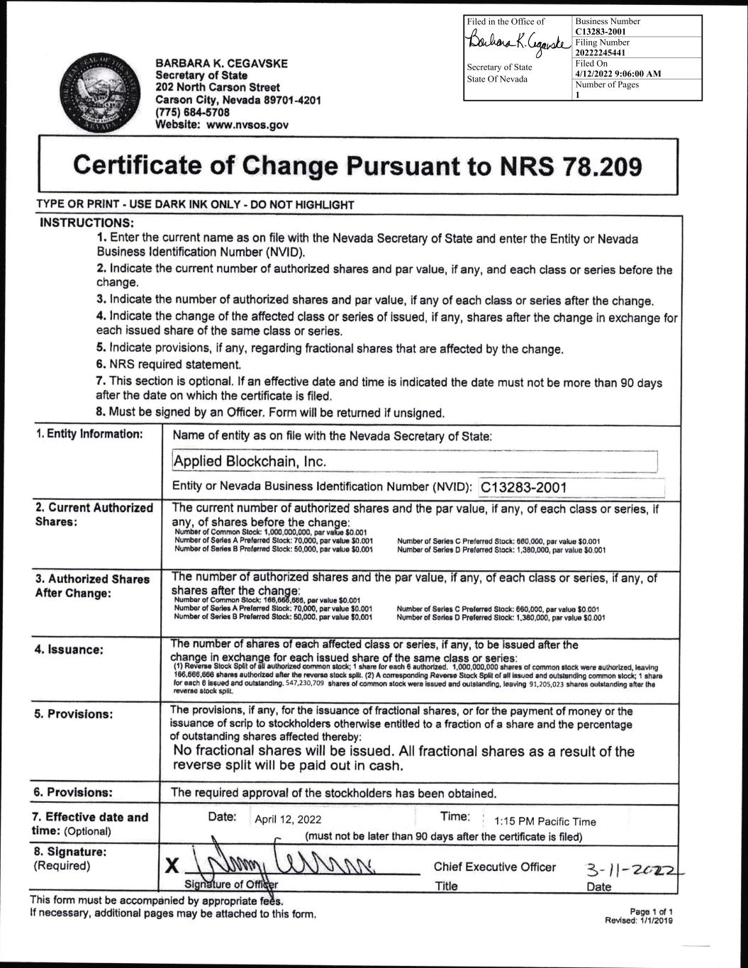 TYPE OR PRINT - USE DARK INK ONLY - DO NOT HIGHLIGHT 1. Entity information: Name of represented entity: Applied Blockchain, Inc. Entity or Nevada Business Identification Number (NVID): (for entities currently on file) NV20011309405 2. Registered Agent Acceptance: Registered Agent Acceptance 3. Information Being Changed: Statement of Change takes the following effect: (select only one) Appoints New Agent (complete section 4) Update Represented Entity Acting as Registered Agent (complete sections 5) Update Registered Agent Name (complete sections 4 & 5) Update Registered Agent Address (complete sections 4 & 5) 4. Registered Agent Information Before the Change: (Non- commercial registered agents ONLY) Name Telephone Nevada 0 Street Address City Zip Code Nevada Mailing Address (only if different from above) City Zip Code 5. Newly Appointed Registered Agent or Registered Agent Information After the Change: Commercial Registered Agent (name only below) Noncommercial Registered Agent (name and address below) Office or position with Entity (title and address below) CAPITOL CORPORATE SERVICES, INC. Name of Registered Agent OR Title of Office or Position with Entity 202 SOUTH MINNESOTA STREET Carson City Nevada 89703 Street Address City Zip Code Nevada Mailing Address (only if different from above) City Zip Code 6. Electronic Notification: (Optional) Email address for electronic notifications for "Non-Commercial" or "Office or Positions with Entity" registered agents only: 7. Certificate of Acceptance of Appointment of Registered Agent: (Required) I hereby accept appointment as Registered Agent for the above named Entity. X DELANIE CASE Authorized Signature of Registered Agent or On Behalf of Registered Agent Entity Date 06/29/2021 8. Signature of Represented Entity: (Required) X DAVID RENCH Authorized Signature On Behalf of the Entity Date 06/29/2021 BARBARA K. CEGAVSKE Secretary of State 202 North Carson Street Carson City, Nevada 89701-4201 (775) 684-5708 Website: www.nvsos.gov www.nvsilverflume.gov Registered Agent Acceptance/Statement of Change This form must be accompanied by appropriate fees. page1 of 1 Filed in the Office of Secretary of State State Of Nevada Business Number C13283-2001 Filing Number 20211566343 Filed On 06/29/2021 07:54:31 AM Number of Pages 1
