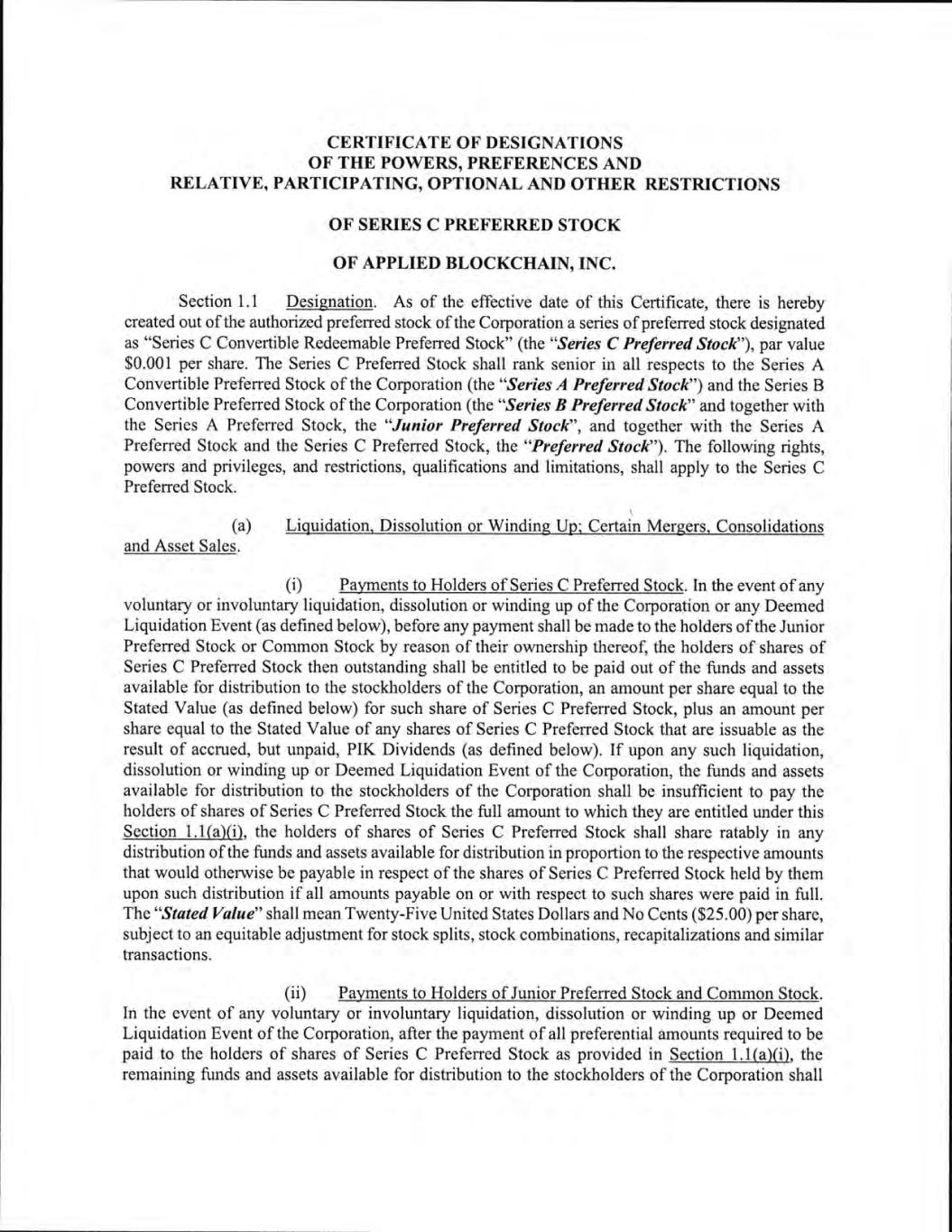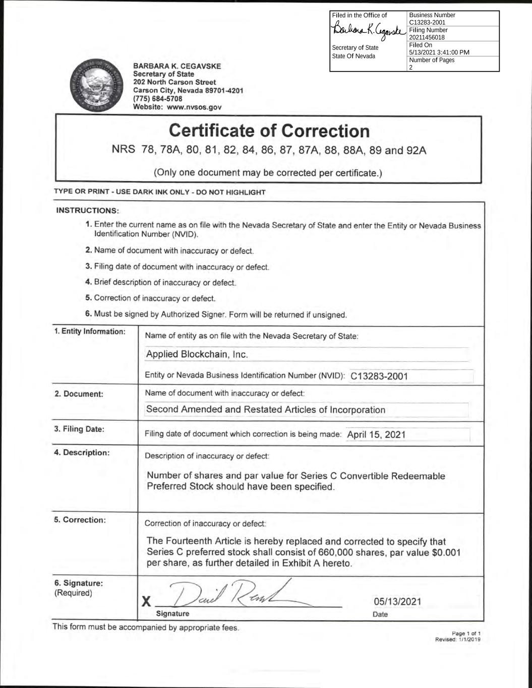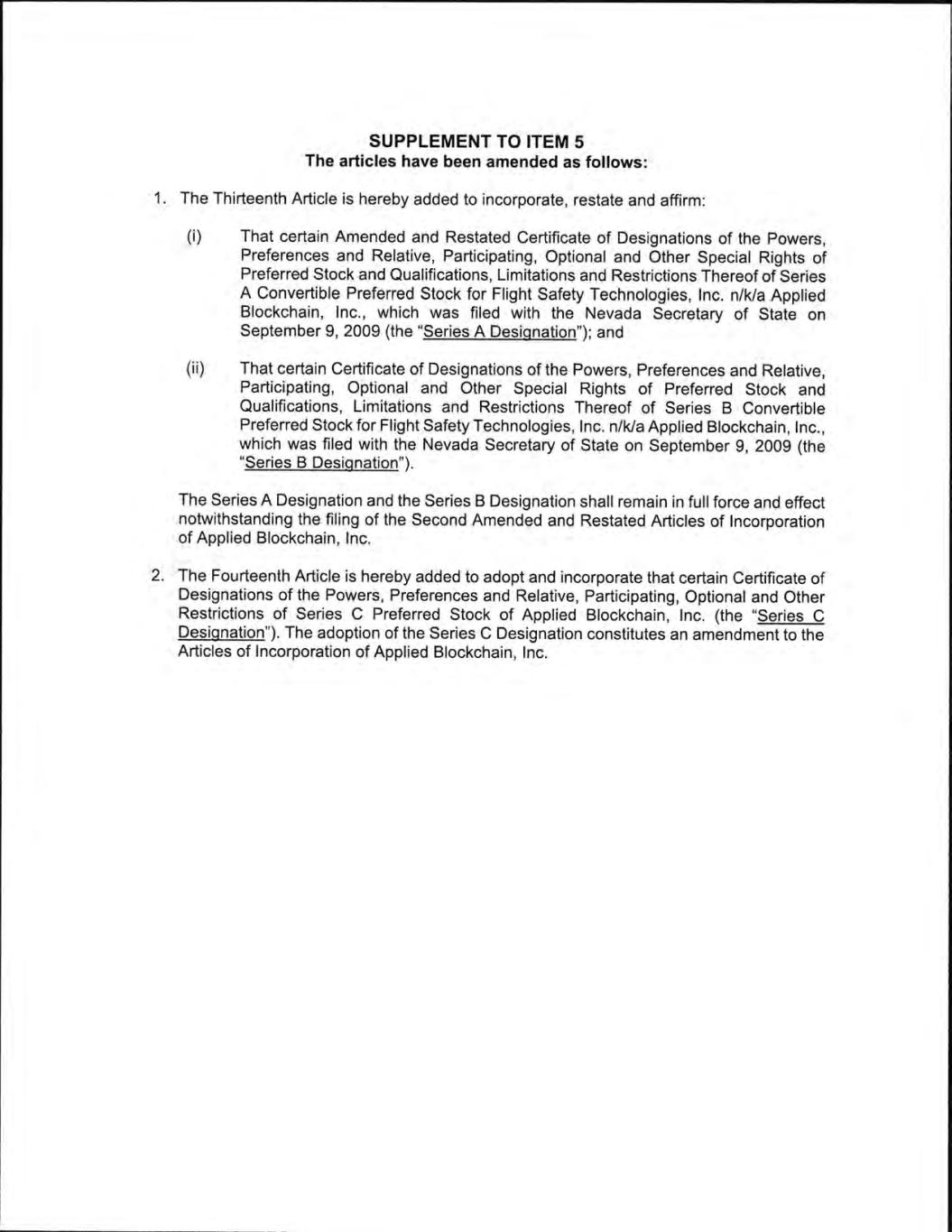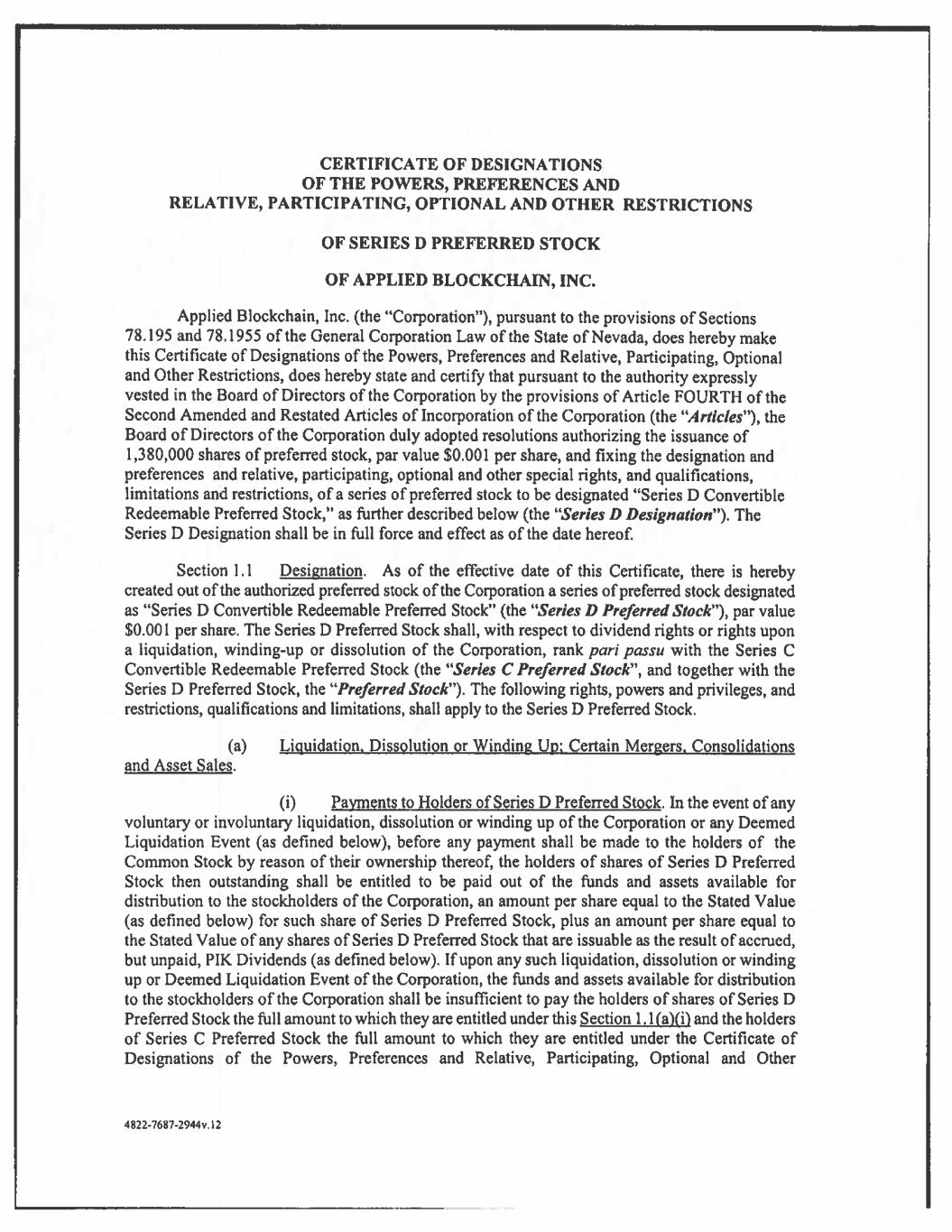 TYPE OR PRINT - USE DARK INK ONLY - DO NOT HIGHLIGHT 1. Entity information: Name of represented entity: Applied Blockchain, Inc. Entity or Nevada Business Identification Number (NVID): (for entities currently on file) NV20011309405 2. Registered Agent Acceptance: Registered Agent Acceptance 3. Information Being Changed: Statement of Change takes the following effect: (select only one) Appoints New Agent (complete section 4) Update Represented Entity Acting as Registered Agent (complete sections 5) Update Registered Agent Name (complete sections 4 & 5) Update Registered Agent Address (complete sections 4 & 5) 4. Registered Agent Information Before the Change: (Non- commercial registered agents ONLY) Name Telephone Nevada 0 Street Address City Zip Code Nevada Mailing Address (only if different from above) City Zip Code 5. Newly Appointed Registered Agent or Registered Agent Information After the Change: Commercial Registered Agent (name only below) Noncommercial Registered Agent (name and address below) Office or position with Entity (title and address below) CAPITOL CORPORATE SERVICES, INC. Name of Registered Agent OR Title of Office or Position with Entity 202 SOUTH MINNESOTA STREET Carson City Nevada 89703 Street Address City Zip Code Nevada Mailing Address (only if different from above) City Zip Code 6. Electronic Notification: (Optional) Email address for electronic notifications for "Non-Commercial" or "Office or Positions with Entity" registered agents only: 7. Certificate of Acceptance of Appointment of Registered Agent: (Required) I hereby accept appointment as Registered Agent for the above named Entity. X DELANIE CASE Authorized Signature of Registered Agent or On Behalf of Registered Agent Entity Date 06/29/2021 8. Signature of Represented Entity: (Required) X DAVID RENCH Authorized Signature On Behalf of the Entity Date 06/29/2021 BARBARA K. CEGAVSKE Secretary of State 202 North Carson Street Carson City, Nevada 89701-4201 (775) 684-5708 Website: www.nvsos.gov www.nvsilverflume.gov Registered Agent Acceptance/Statement of Change This form must be accompanied by appropriate fees. page1 of 1 Filed in the Office of Secretary of State State Of Nevada Business Number C13283-2001 Filing Number 20211566343 Filed On 06/29/2021 07:54:31 AM Number of Pages 1