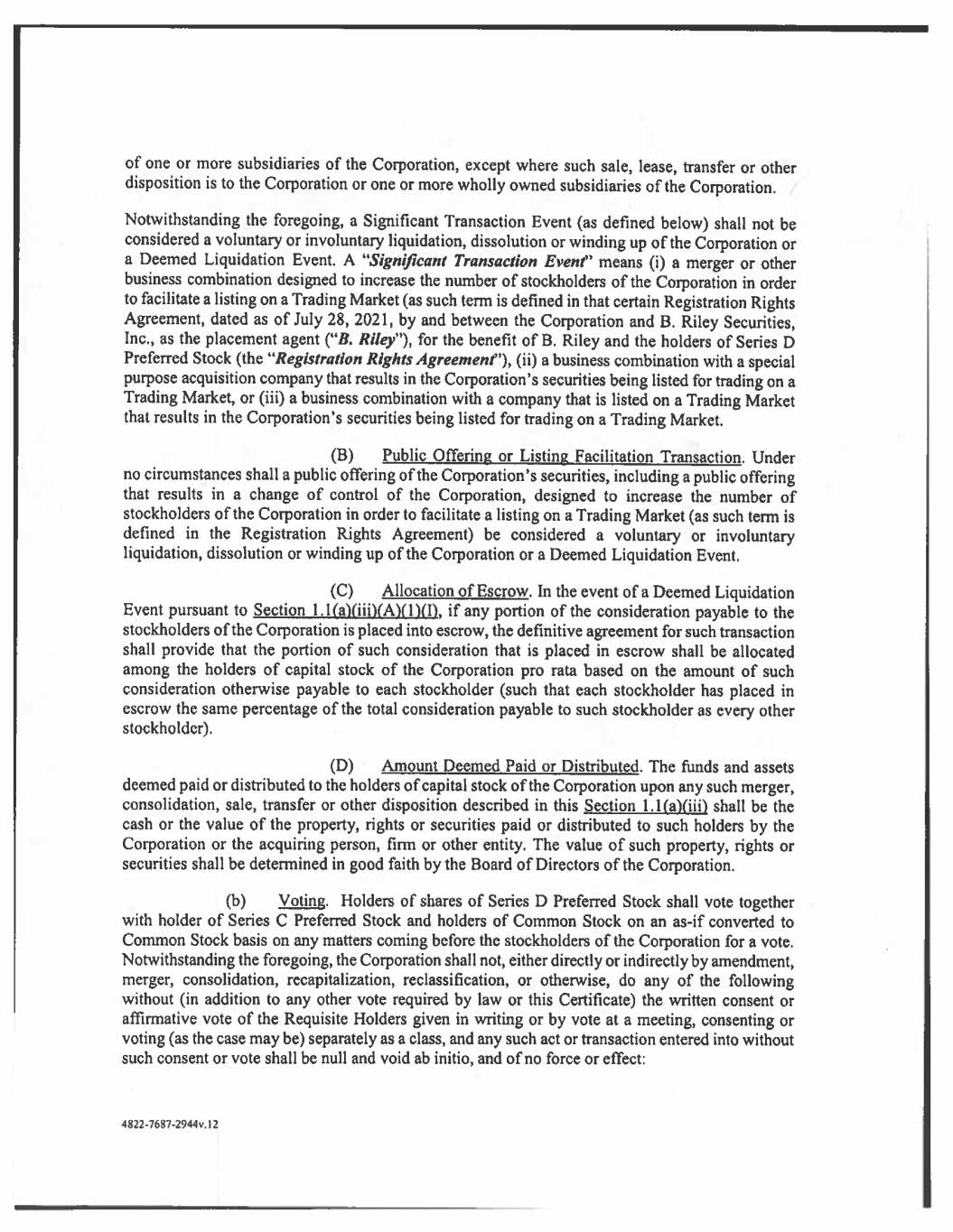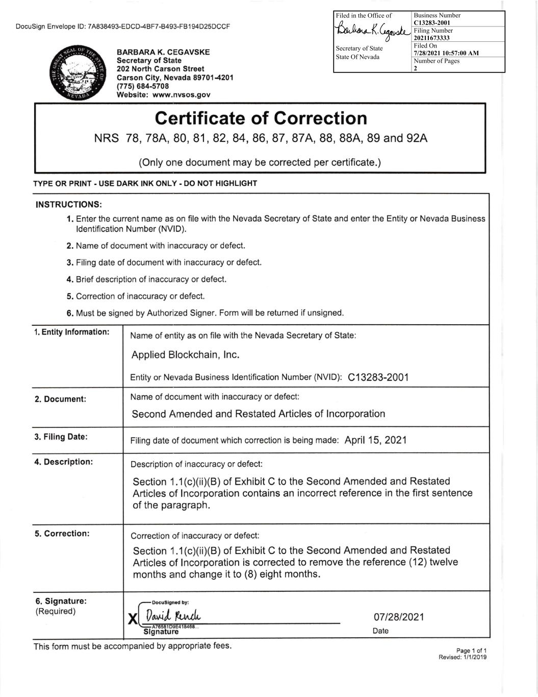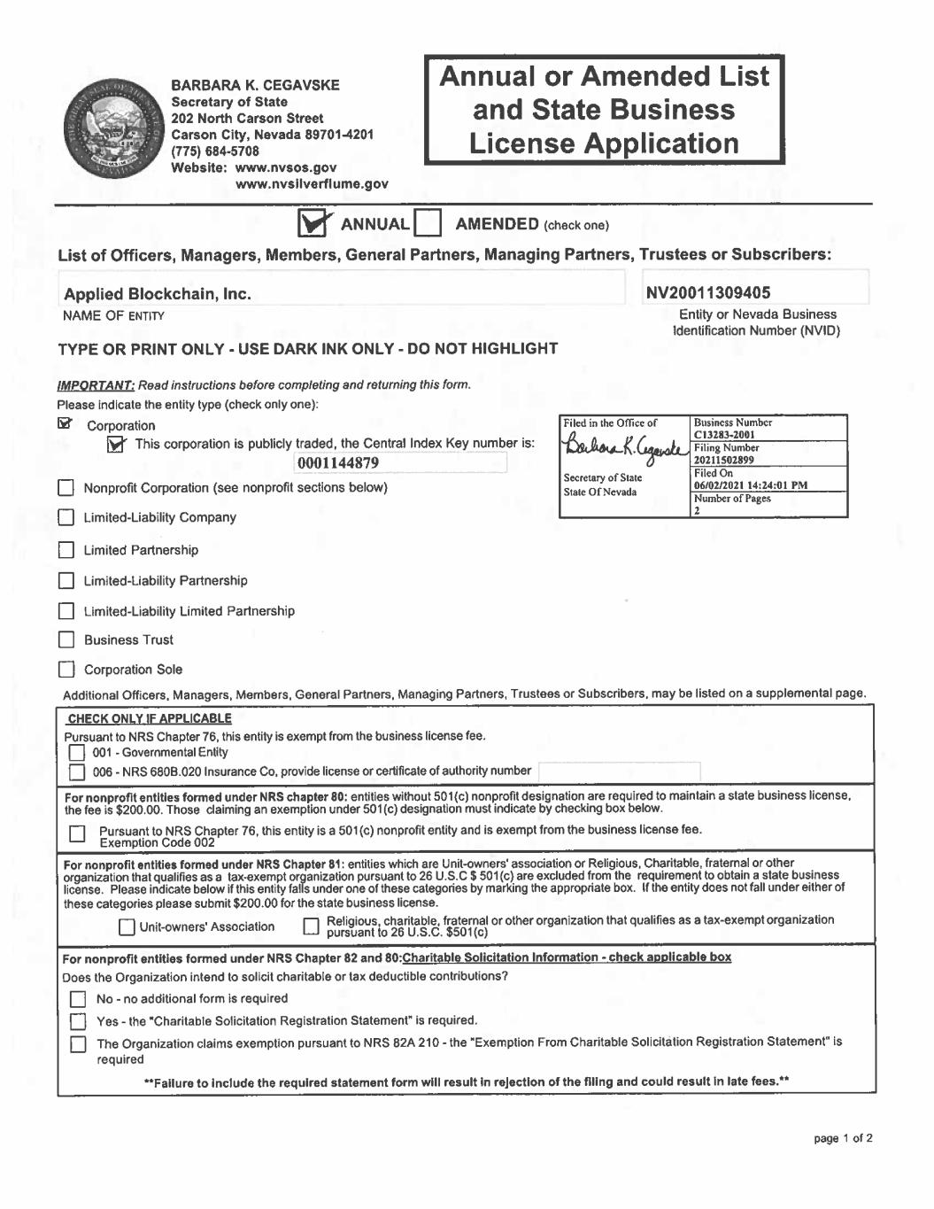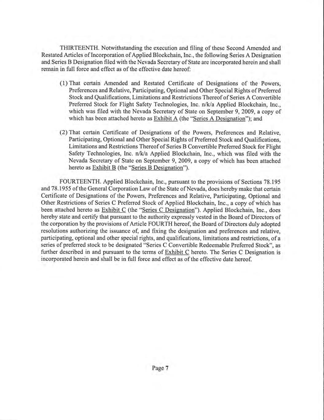 TYPE OR PRINT - USE DARK INK ONLY - DO NOT HIGHLIGHT 1. Entity information: Name of represented entity: Applied Blockchain, Inc. Entity or Nevada Business Identification Number (NVID): (for entities currently on file) NV20011309405 2. Registered Agent Acceptance: Registered Agent Acceptance 3. Information Being Changed: Statement of Change takes the following effect: (select only one) Appoints New Agent (complete section 4) Update Represented Entity Acting as Registered Agent (complete sections 5) Update Registered Agent Name (complete sections 4 & 5) Update Registered Agent Address (complete sections 4 & 5) 4. Registered Agent Information Before the Change: (Non- commercial registered agents ONLY) Name Telephone Nevada 0 Street Address City Zip Code Nevada Mailing Address (only if different from above) City Zip Code 5. Newly Appointed Registered Agent or Registered Agent Information After the Change: Commercial Registered Agent (name only below) Noncommercial Registered Agent (name and address below) Office or position with Entity (title and address below) CAPITOL CORPORATE SERVICES, INC. Name of Registered Agent OR Title of Office or Position with Entity 202 SOUTH MINNESOTA STREET Carson City Nevada 89703 Street Address City Zip Code Nevada Mailing Address (only if different from above) City Zip Code 6. Electronic Notification: (Optional) Email address for electronic notifications for "Non-Commercial" or "Office or Positions with Entity" registered agents only: 7. Certificate of Acceptance of Appointment of Registered Agent: (Required) I hereby accept appointment as Registered Agent for the above named Entity. X DELANIE CASE Authorized Signature of Registered Agent or On Behalf of Registered Agent Entity Date 06/29/2021 8. Signature of Represented Entity: (Required) X DAVID RENCH Authorized Signature On Behalf of the Entity Date 06/29/2021 BARBARA K. CEGAVSKE Secretary of State 202 North Carson Street Carson City, Nevada 89701-4201 (775) 684-5708 Website: www.nvsos.gov www.nvsilverflume.gov Registered Agent Acceptance/Statement of Change This form must be accompanied by appropriate fees. page1 of 1 Filed in the Office of Secretary of State State Of Nevada Business Number C13283-2001 Filing Number 20211566343 Filed On 06/29/2021 07:54:31 AM Number of Pages 1