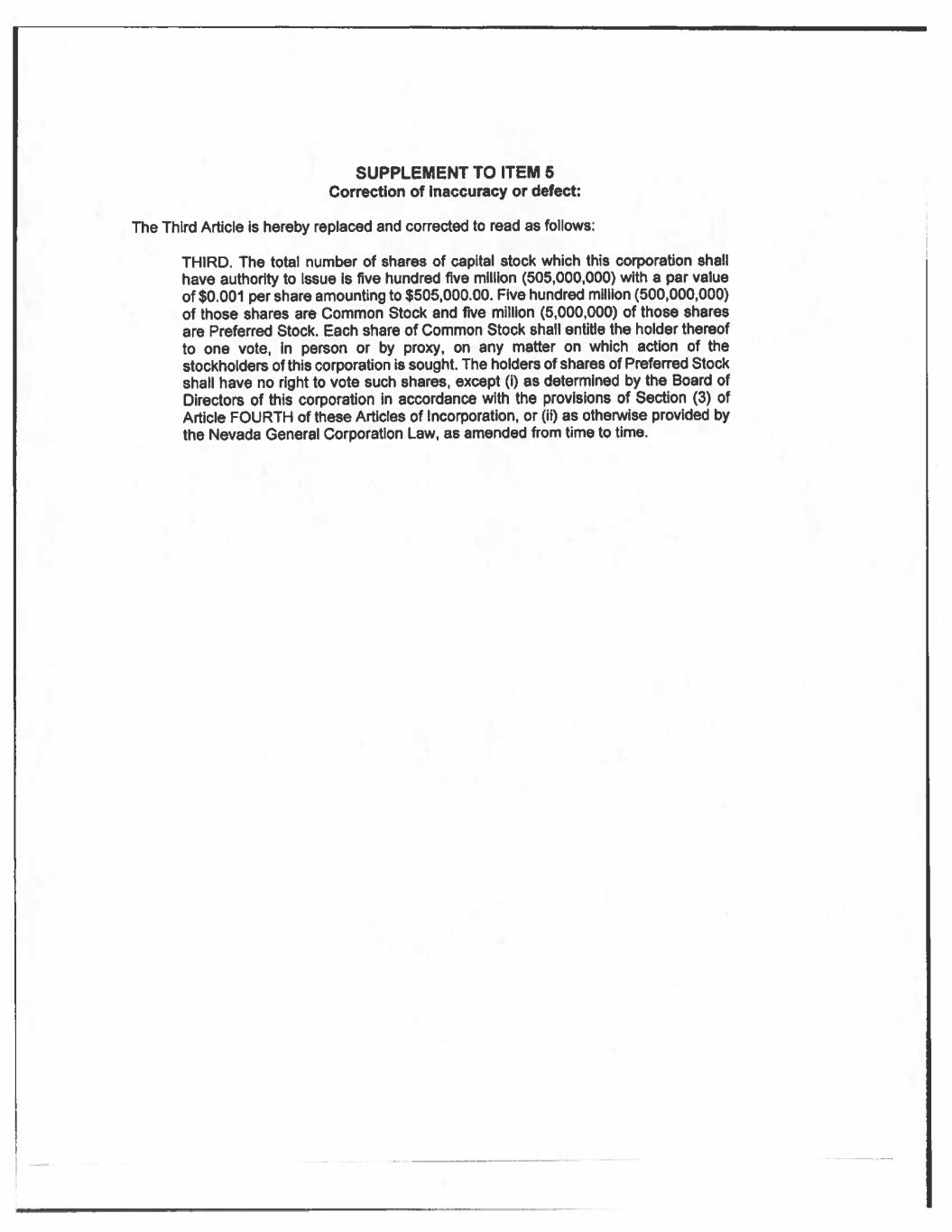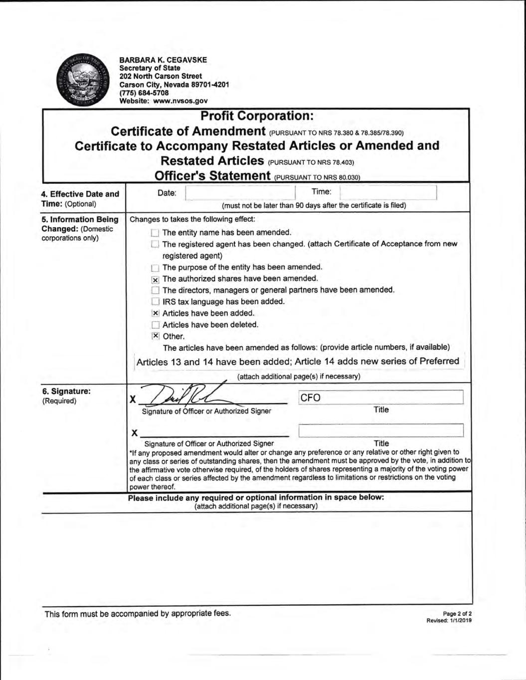 Filed in the Office of Secretary of State State Of Nevada Business Number C13283-2001 Filing Number 20211456018 Filed On 5/13/2021 3:41:00 PM Number of Pages 2