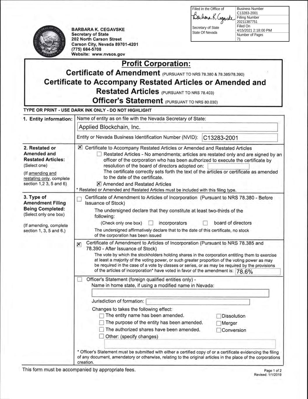 Filed in the Office of Secretary of State State Of Nevada Business Number C13283-2001 Filing Number 20211387751 Filed On 4/15/2021 2:18:00 PM Number of Pages 71